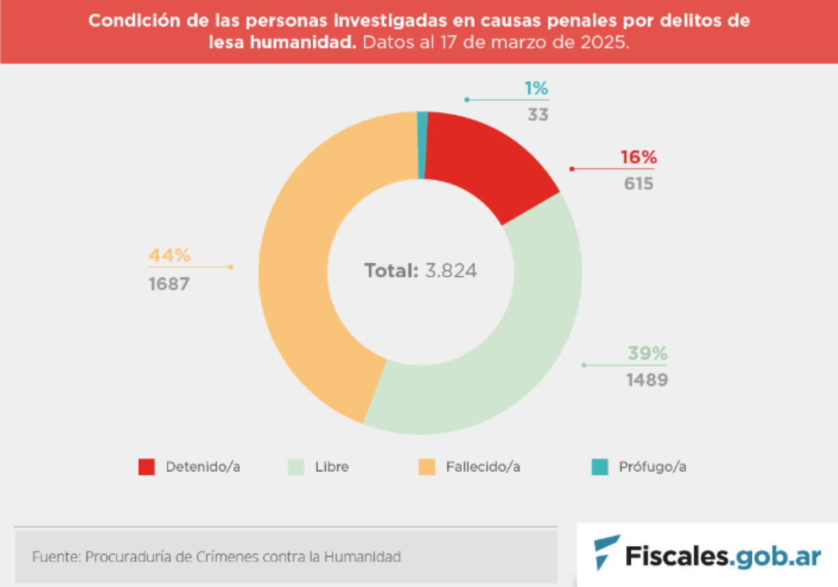 Un total de 3.824 personas están involucradas en causas penales por delitos de lesa humanidad. De ellas, 502 están imputadas, 401 ya han sido procesadas y esperan juicio, 158 cuentan con falta de mérito (es decir, no hay pruebas suficientes para procesarlas ni para sobreseerlas), 118 han sido sobreseídas, y 27 personas han sido indagadas y esperan la resolución de su situación procesal.
