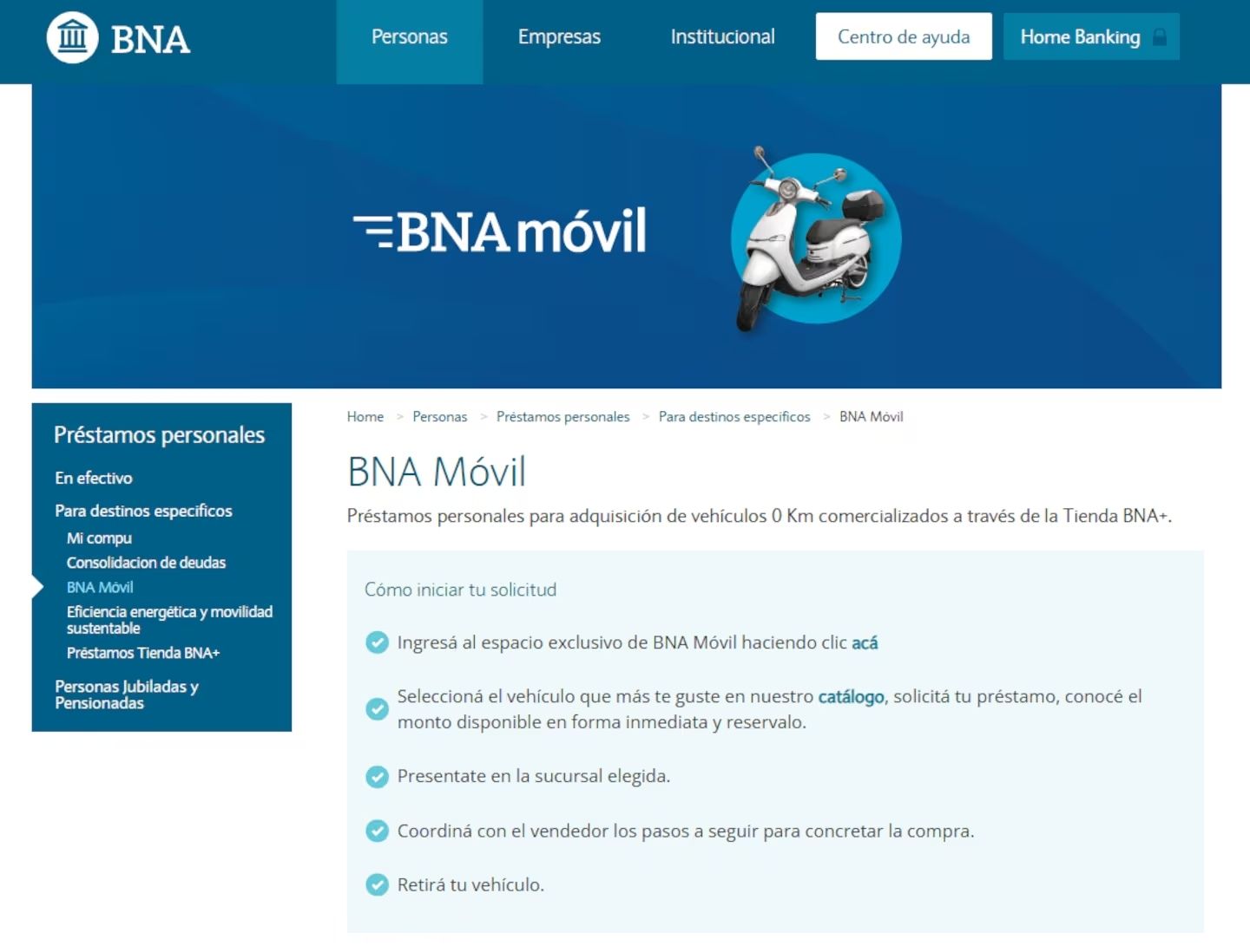 La línea está dirigida a la compra de vehículos nuevos como motocicletas, monopatines eléctricos y bicicletas con asistencia eléctrica. También se pueden incluir accesorios como cascos o indumentaria, siempre y cuando estén publicados junto con el vehículo dentro de la misma oferta en la Tienda BNA+.