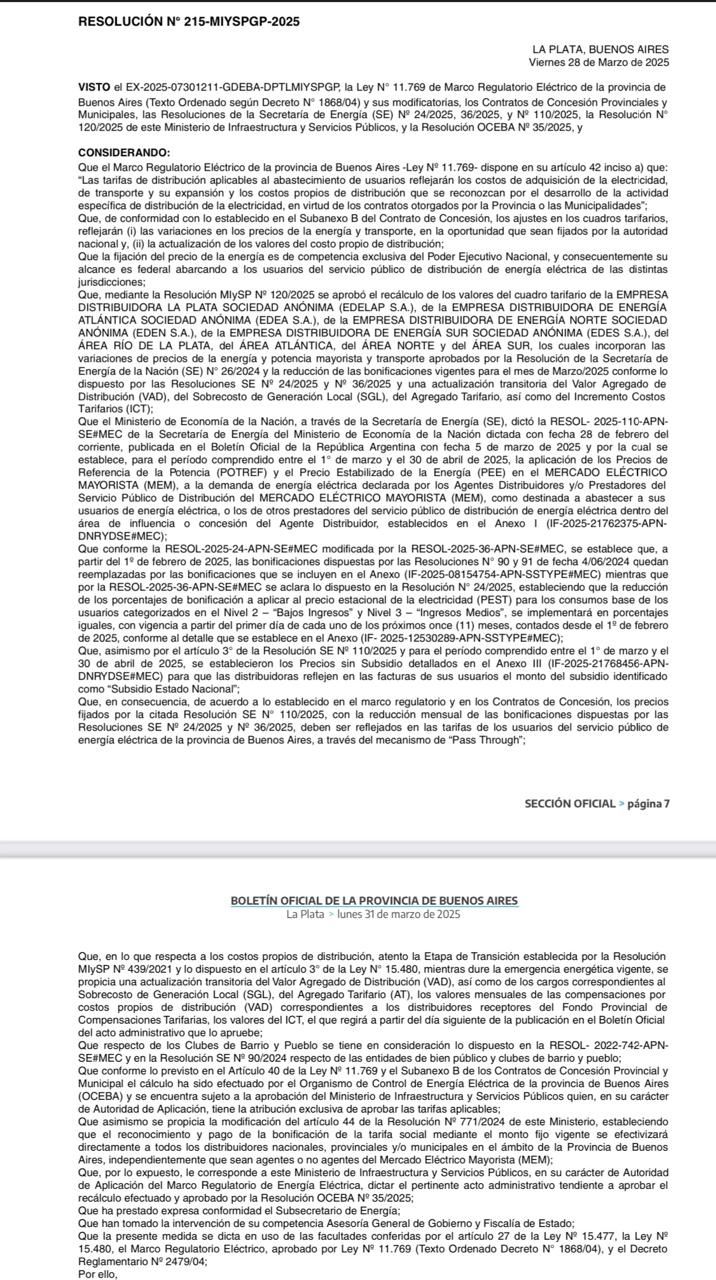 En la Resolución publicada en el Boletín Oficial se detalla que en el ajuste del cuadro tarifario se busca mantener el equilibrio financiero del sistema eléctrico en la provincia de Buenos Aires y garantizar la continuidad del servicio en un contexto de aumento generalizado de costos.