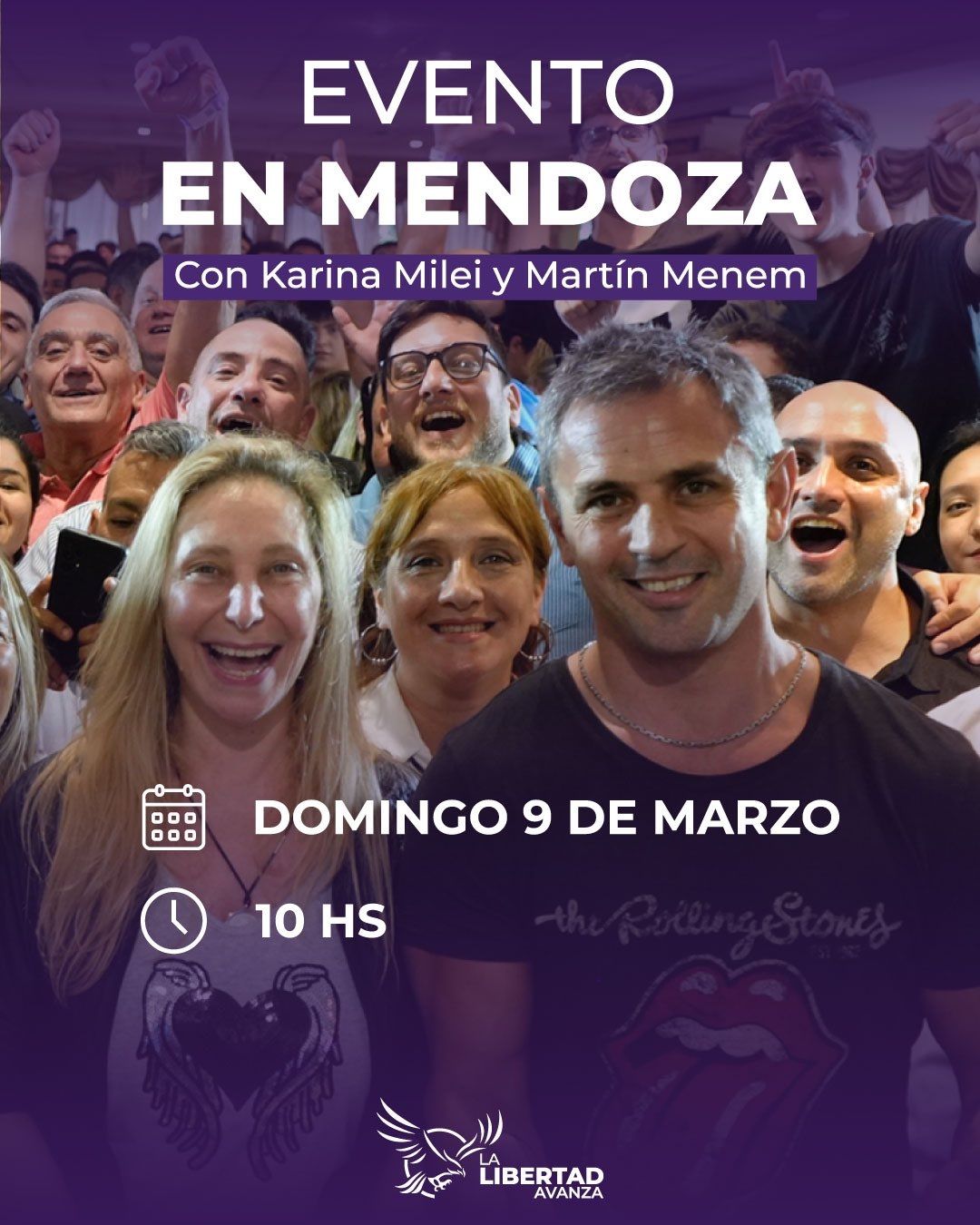 "Mendoza recibe a los líderes de la libertad. Desde La Libertad Avanza Mendoza, es un honor dar la bienvenida a Karina Milei y Martín Menem, quienes encabezan la transformación que Argentina necesita", confirmó el apoderado del partido local, Facundo Correa Llano.