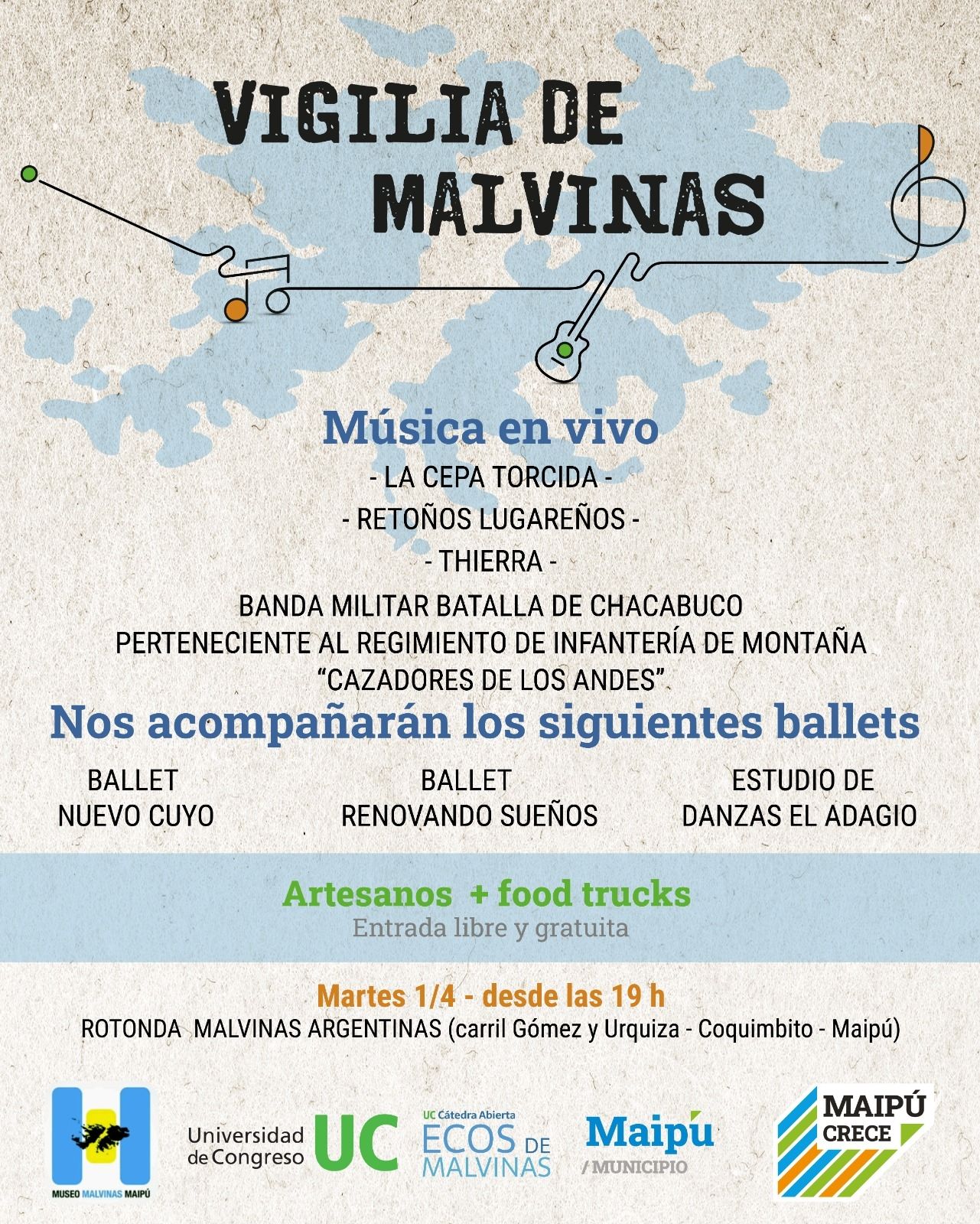 En Maipú las actividades comenzaron el 1 de abril a las 19 con la Vigilia de Malvinas en la rotonda Malvinas Argentinas de Coquimbito (carril Gómez y Urquiza). Durante toda la noche habrá música en vivo, danzas, patio de comidas y artesanos.