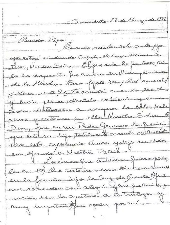 ¿Te acordás cuando era chico y hacía planes, diseñaba vehículos y armas, todos destinados a recuperar las islas Malvinas y restaurar en ellas Nuestra Soberanía? Dios, que es un Padre Generoso ha querido que éste, su hijo, totalmente carente de méritos, viva esta experiencia única y deje su vida en ofrenda a nuestra Patria.