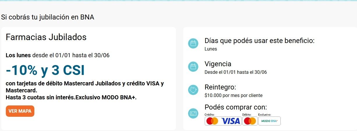 La promoción está vigente únicamente los días lunes, y permite acumular reintegros mensuales por hasta $10.000. Si un jubilado realiza múltiples compras durante el mes usando diferentes medios de pago habilitados, el beneficio se aplicará hasta alcanzar ese límite. El monto ahorrado se acredita dentro de los 30 días posteriores a la transacción, directamente en la cuenta asociada a MODO BNA+ de la persona que realizó la compra.