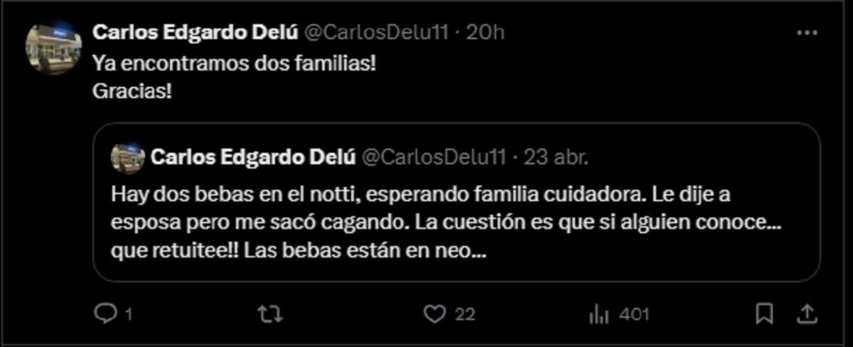 “Hay dos bebas en el Notti, esperando familia cuidadora. Le dije a esposa pero me sacó cagando. La cuestión es que si alguien conoce... que retuitee!! Las bebas están en neo…”, escribió ayer a la tarde Carlos Edgardo Delú en su cuenta de “X”.