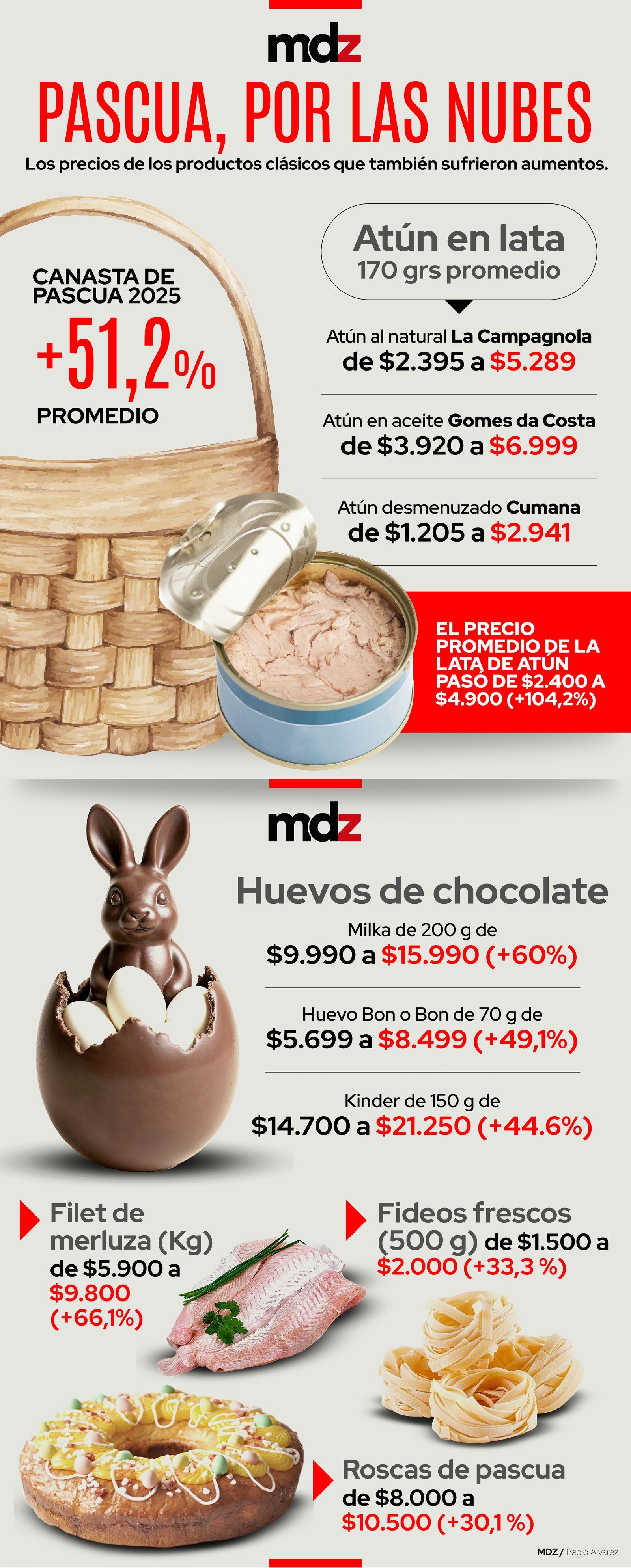 Según el trabajo, la Canasta de Pascua 2025 aumentó en promedio un 51,2%, con picos del 104% en productos como el atún enlatado.