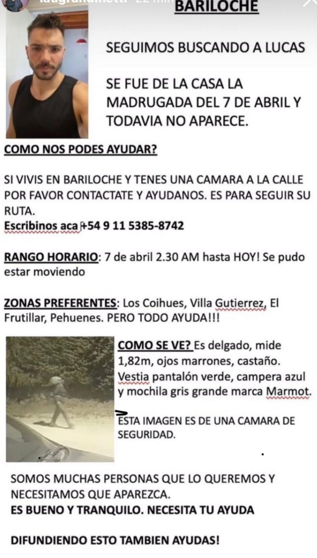Una de las familiares, Marisa Mondino, expresó a través de las redes sociales: "Seguimos buscando a Lucas. Se fue de su casa el 7 de abril y todavía no aparece. Si vivís en Bariloche y tenés una cámara a la calle por favor contactate y ayudanos. Somos muchas las personas que lo queremos y necesitamos que aparezca. Es bueno y tranquilo. Necesitamos tu ayuda", concluyó.
