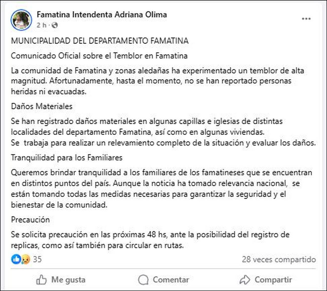 Además, Olima mencionó afectaciones en iglesias centenarias de la zona: “Son construcciones muy antiguas, de más de 100 años. Varias presentaron grietas, al igual que algunas casas”. En tanto, informó que desde el mediodía algunas localidades continúan sin servicio de energía eléctrica.