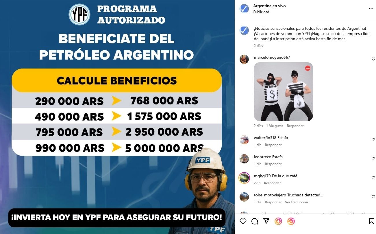 La empresa YPF desmintió cualquier vínculo con estas publicaciones. A través de sus canales oficiales, aclararon que no existe ningún plan de inversión de esas características y advirtieron que todas sus acciones se comunican únicamente mediante medios verificados. “No participes, ni hagas clic en esos enlaces”, fue uno de los mensajes difundidos por la compañía.