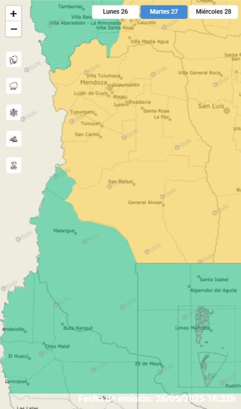 La tercera es un alerta por nevadas en la zona cordillerana de Las Heras y el Valle de Uco. "El área será afectada por nevadas persistentes y de variada intensidad, algunas localmente fuertes. Se estiman valores de nieve acumulada entre 30 y 50 centímetros, pudiendo ser superados de forma puntual. En las zonas más bajas, la precipitación podría presentarse en forma de lluvia".