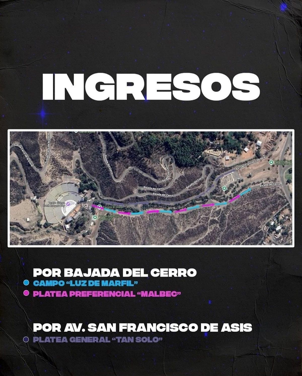 Desde la Subsecretaría de cultura informaron que hay ingresos diferenciados. Para las personas con entradas en campo "Luz de marfil" y Platea preferencial "Malbec" el ingreso será por la bajada del cerro. Los asistentes con entrada platea general "Tan solo", el acceso será por San Francisco de Asís.