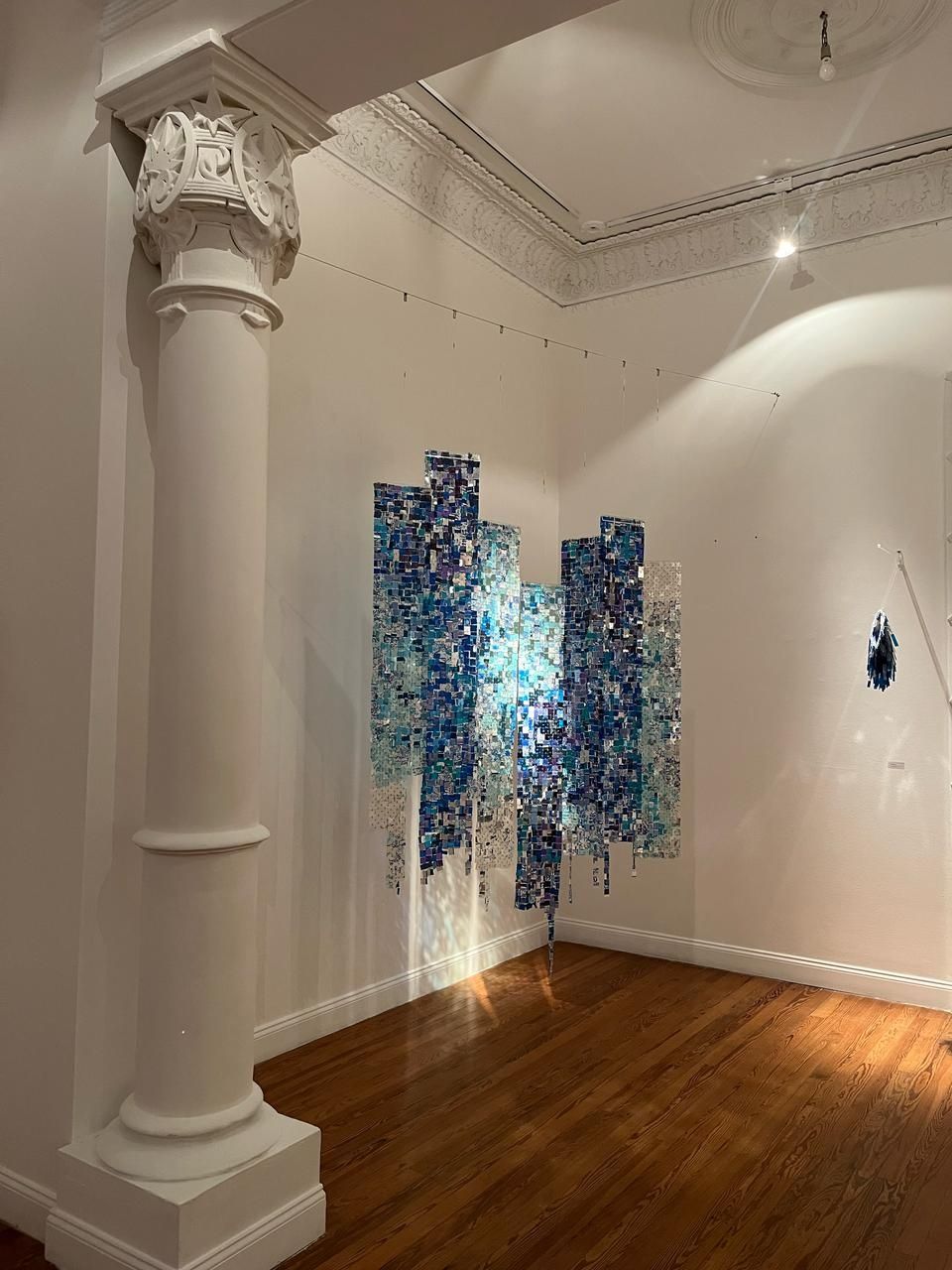 María Victoria Silva y Viviana Debicki poseen, cada una en su propio lenguaje, un bagaje técnico envidiable nutrido de una preparación e investigación constantes en el campo del arte. Las obras, que fluyen como el agua de sala en sala, son para el asombro. Se despliegan livianas e ingrávidas desde las grandes alturas de estos espacios. Si bien se puede catalogar esta instalación de a dos dentro de lo que habitualmente se denomina “Arte textil”, creo que el talento y originalidad de las artistas excede ampliamente tal denominación. María Victoria Silva en esta etapa, de su profusa carrera, se ha dedicado a trabajar sobre conceptos relacionados con la conservación de la naturaleza, haciendo hincapié en la idea de protección de la misma. Muchas de sus piezas se basan en los cuatro elementos: tierra, agua, aire y fuego, Junto a la idea de elevación del espíritu humano, en pos de la paz y la hermandad.