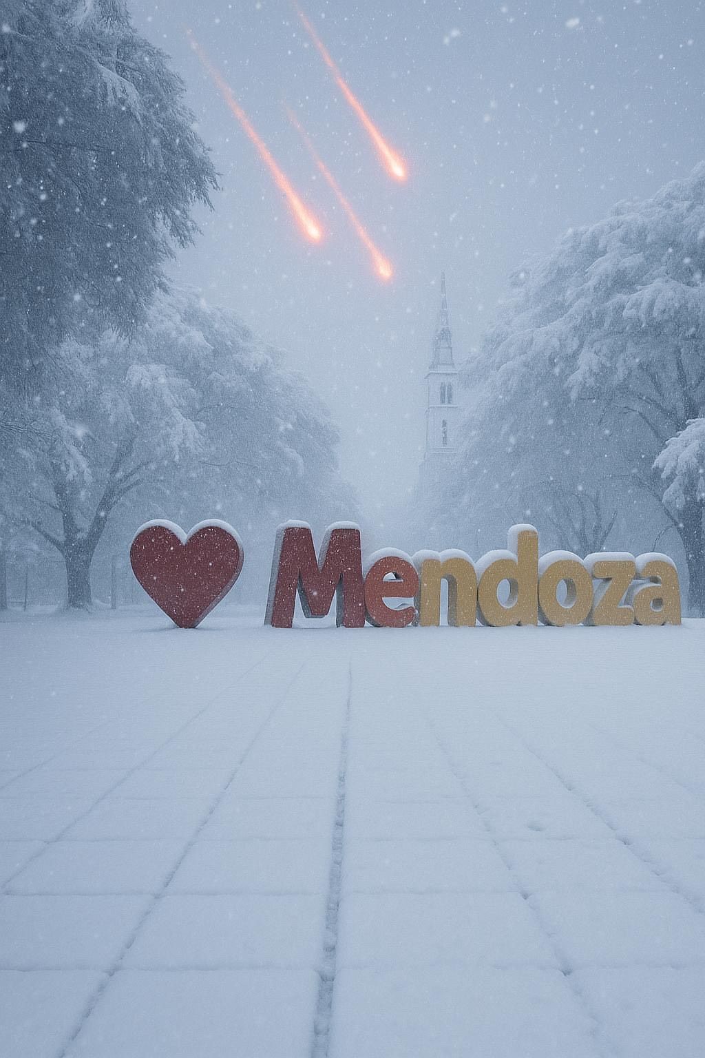 En la imagen se ve el cartel, cubierto de nieve, y en el fondo de la misma se pueden ver unas bolas de fuego que caen sobre el cielo mendocino.