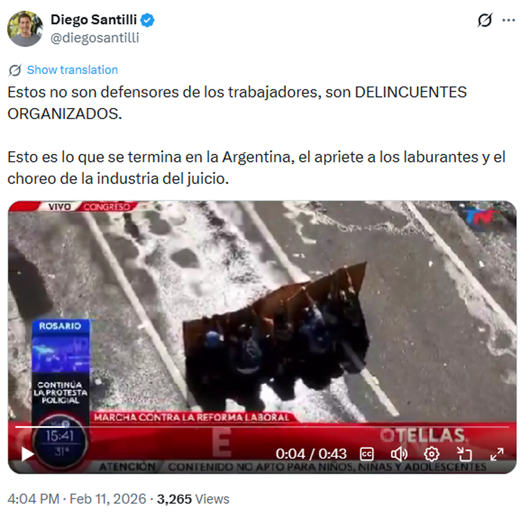 El Ministro del Interior Diego Santilli apuntó directamente contra los manifestantes que arrojaron bombas Molotov contra la Policía en la marcha contra la reforma laboral, y afirmó que "estos no son defensores de los trabajadores, son DELINCUENTES ORGANIZADOS".