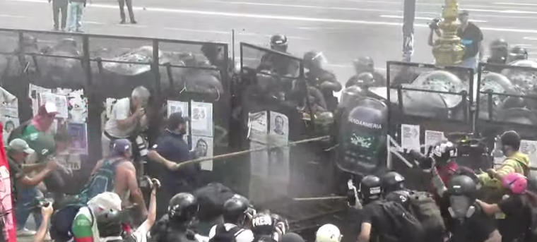 Alrededor de las 15:30, un grupo de manifestantes intentó tirar las vallas que la Policía colocó como parte de la activación del protocolo antipiquete y derivó en un breve enfrentamiento entre las personas que se encontraban protestando y los efectivos. No hay heridos, pero se reportaron bombas de estruendo y pirotecnia en la marcha.