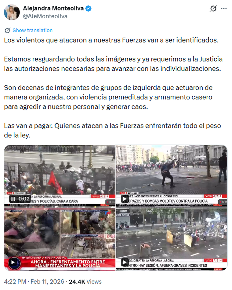 "Los violentos que atacaron a nuestras Fuerzas van a ser identificados" afirmó la Ministra de Seguridad Monteoliva en su cuenta de X luego de la desconcentración de la marcha contra la reforma laboral que impulsa el Gobierno.