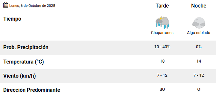 En cuanto a las chances que hay de que caigan chaparrones, oscilan entre el 10 y 40%. Además, se espera que las temperaturas oscilen entre 14°C y 18°C, con cielo mayormente nublado durante todo el día, y para la noche, se espera cielo algo nublado y una temperatura de 14°.