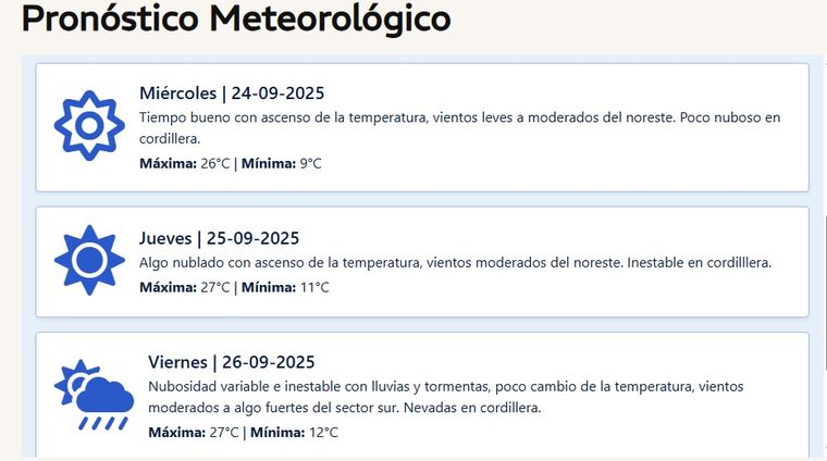 La Dirección de Contingencias Climáticas de Mendoza coincide con el escenario húmedo para el viernes 26-09-2025. El organismo anticipa nubosidad variable, ambiente inestable, lluvias y tormentas. El cambio térmico sería escaso. Se esperan vientos moderados a algo fuertes del sector sur.
