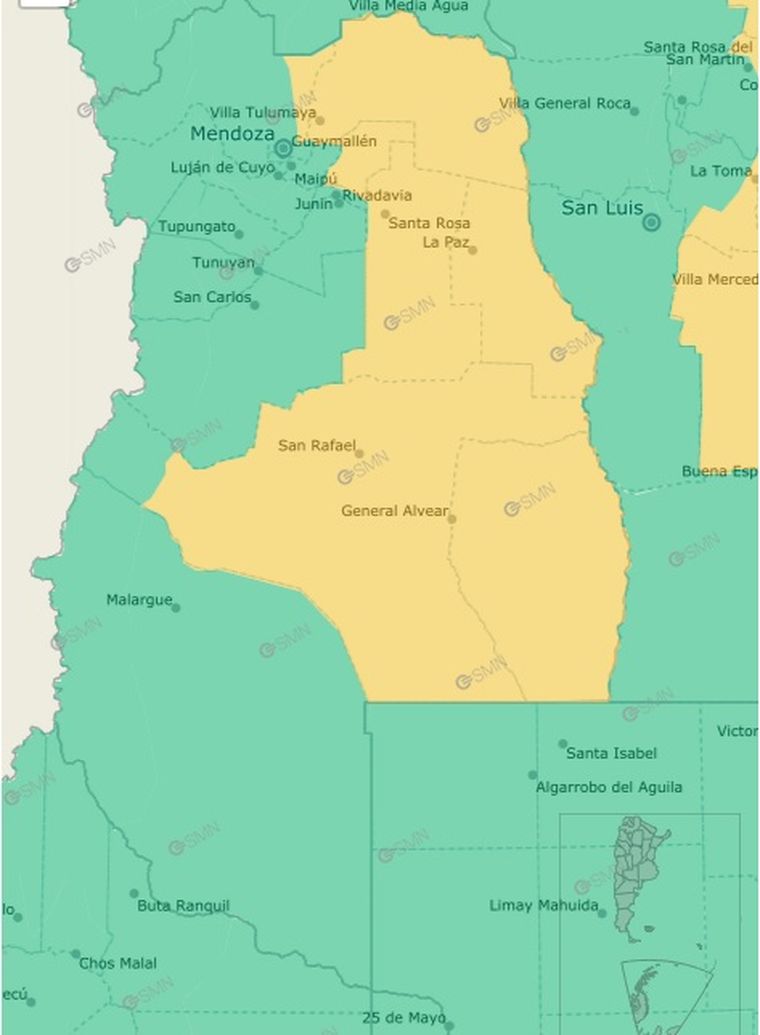 El Servicio Meteorológico Nacional emitió una alerta amarilla por temperaturas extremas para buena parte del territorio mendocino. El aviso abarca el este de Las Heras, La Paz, Lavalle, San Martín, Santa Rosa, General Alvear y el llano de San Rafael. Se trata de áreas donde las marcas térmicas pueden tener un impacto sanitario moderado, sobre todo en personas mayores, niños pequeños y quienes padecen enfermedades crónicas.