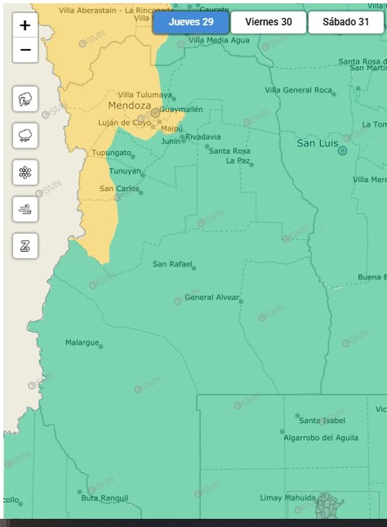 El SMN activó una alerta amarilla para sectores del Gran Mendoza y áreas cordilleranas por tormentas fuertes que pueden traer granizo.