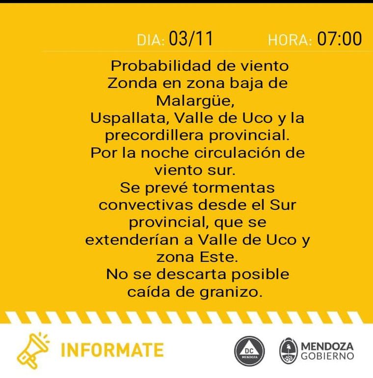 Defensa Civil provincial sumó un dato clave para este lunes. Existe probabilidad de viento Zonda en la zona baja de Malargüe, en Uspallata, en el Valle de Uco y a lo largo de la precordillera. El Zonda reseca el ambiente, eleva la temperatura y puede afectar a personas con afecciones respiratorias. La recomendación es hidratarse, evitar el fuego y limitar la actividad física intensa.