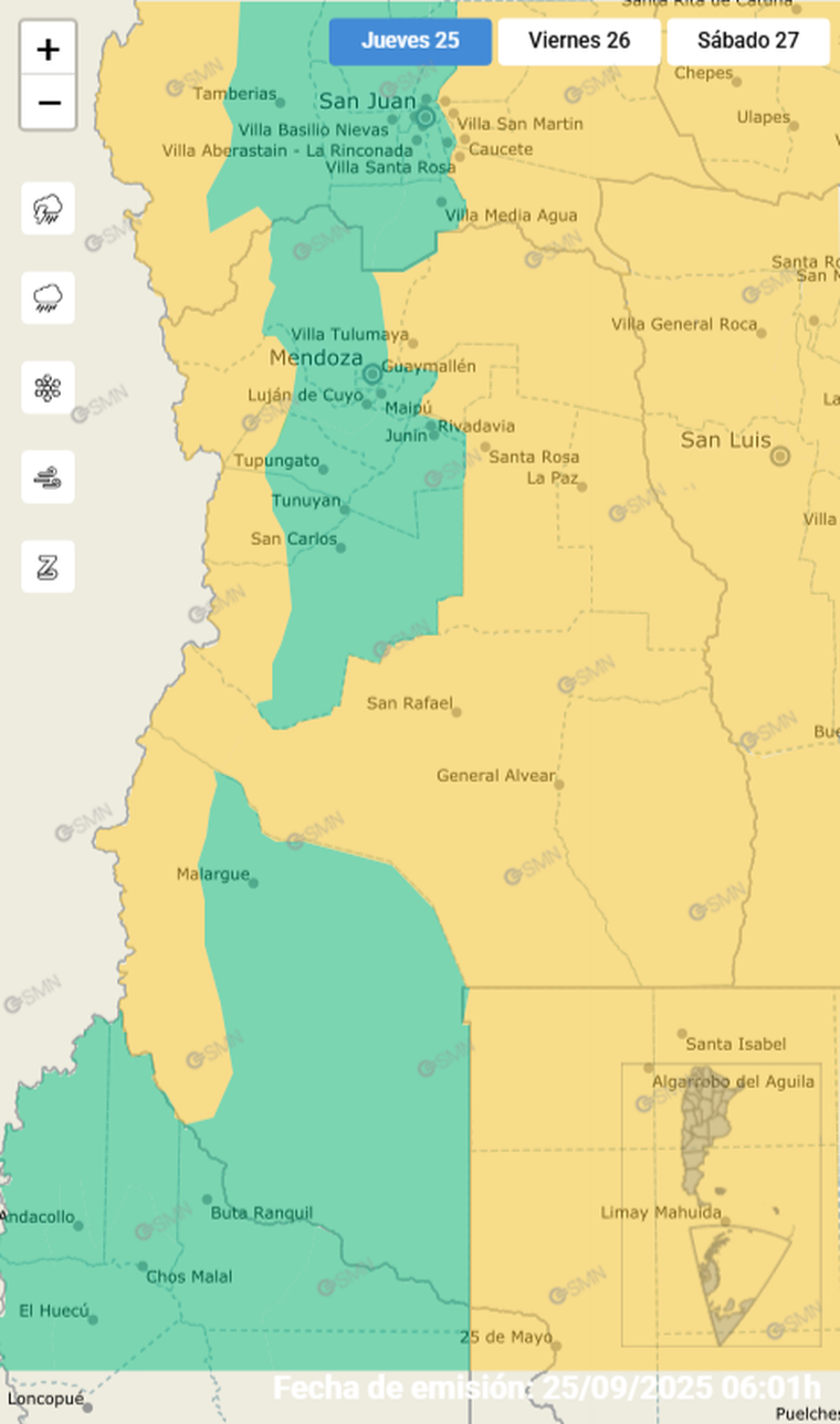 A pesar de este panorama templado en el Gran Mendoza, gran parte de la provincia estará bajo alerta amarilla por vientos. El SMN informó que "el área será afectada por vientos del norte o noreste, con velocidades entre 40 y 60 km/h y ráfagas que pueden superar los 80 km/h, especialmente en zonas serranas". "La provincia de San Luis, el este de Mendoza, el este de San Juan, el este de La Rioja, el noroeste de Córdoba y el sur de Catamarca serán afectados por vientos del norte o noreste", agregó el organismo.