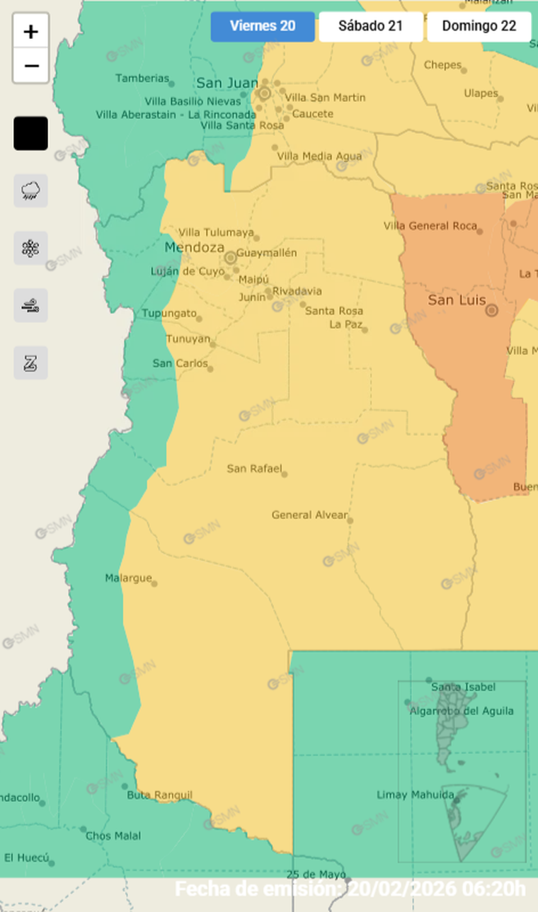 Además del aviso nacional, la provincia difundió su propio panorama para este viernes 20 de febrero de 2026. El reporte local prevé nubosidad variable, pocos cambios en la temperatura y tormentas de intensidad entre moderada y severa, con incremento del viento hacia la noche. También se esperan precipitaciones en cordillera. En ese esquema, la máxima rondaría los 28 °C y la mínima, los 18 °C.