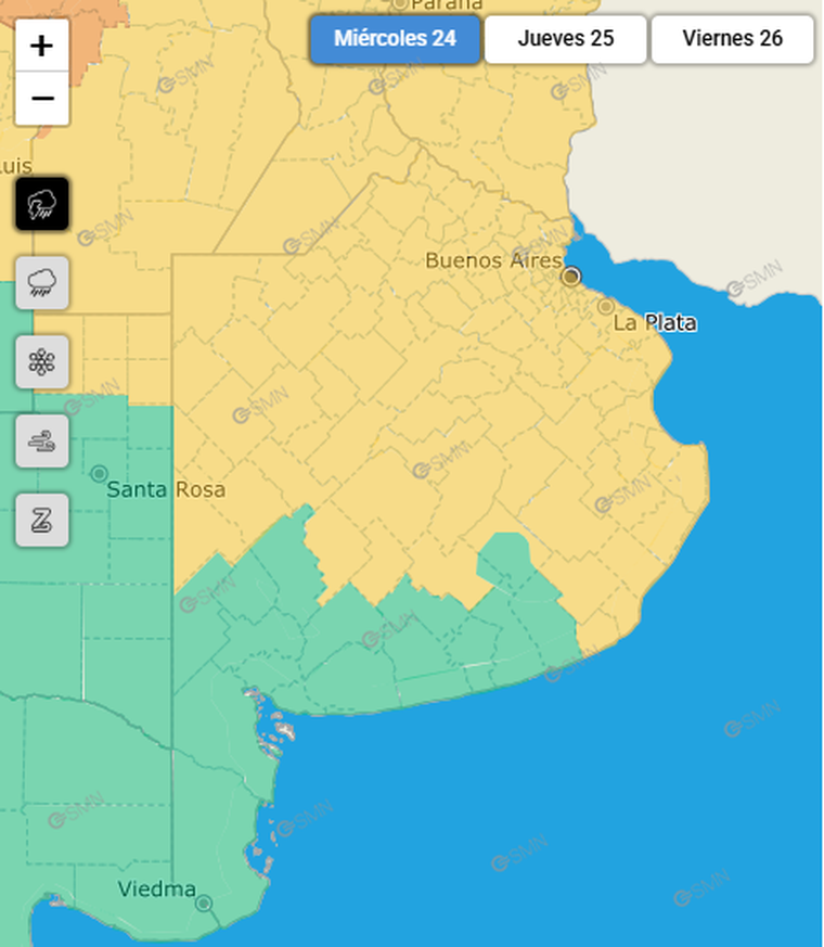 Según el mapa del SMN, el alerta rige para toda la zona norte y centro de la Provincia de Buenos Aires, incluida la Ciudad.