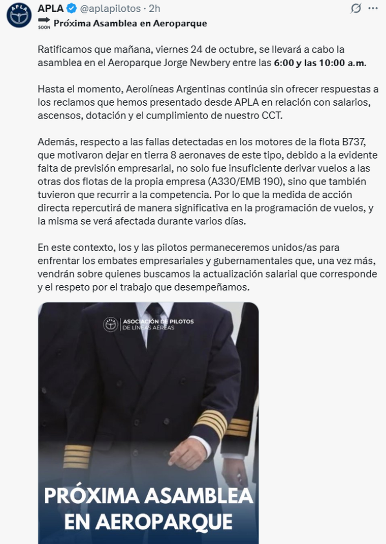 De acuerdo con lo informado por el gremio a través de las redes sociales, la asamblea tiene lugar el viernes por la mañana. “Ratificamos que este viernes 24 de octubre, se llevará a cabo la asamblea en el Aeroparque Jorge Newbery entre las 6:00 y las 10:00”, reza el comunicado.