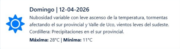 Según el Servicio Meteorológico Nacional, desde temprano, el día comenzará con cielo algo nublado en sectores del sur y el este provincial, mientras que en el resto del territorio se espera tiempo relativamente estable. Sin embargo, hacia la tarde el panorama empezará a modificarse con un incremento de la nubosidad, especialmente en el Valle de Uco.