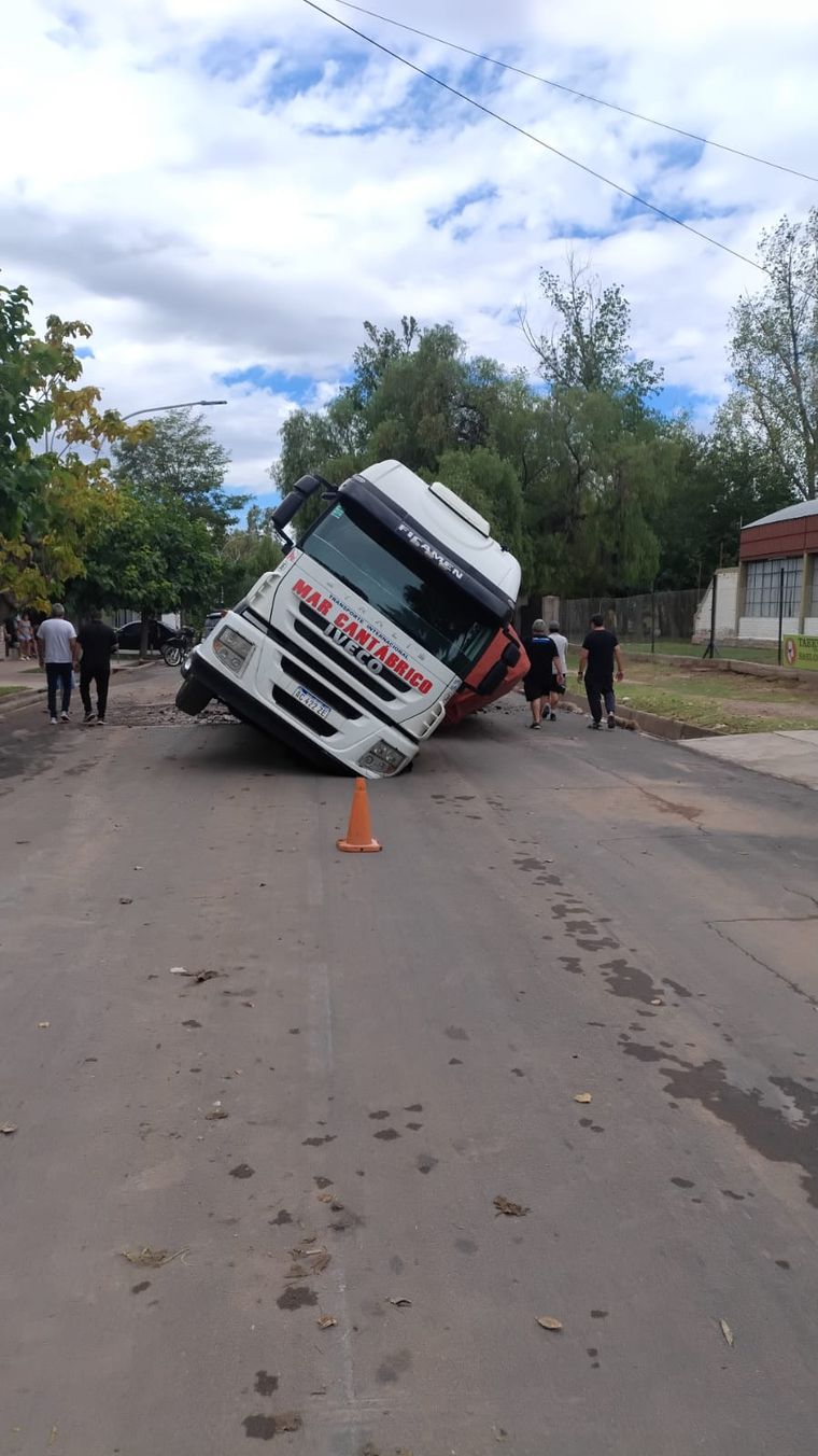 Un camión quedó hundido en la calle Alsina de Luzuriaga, Maipú,.