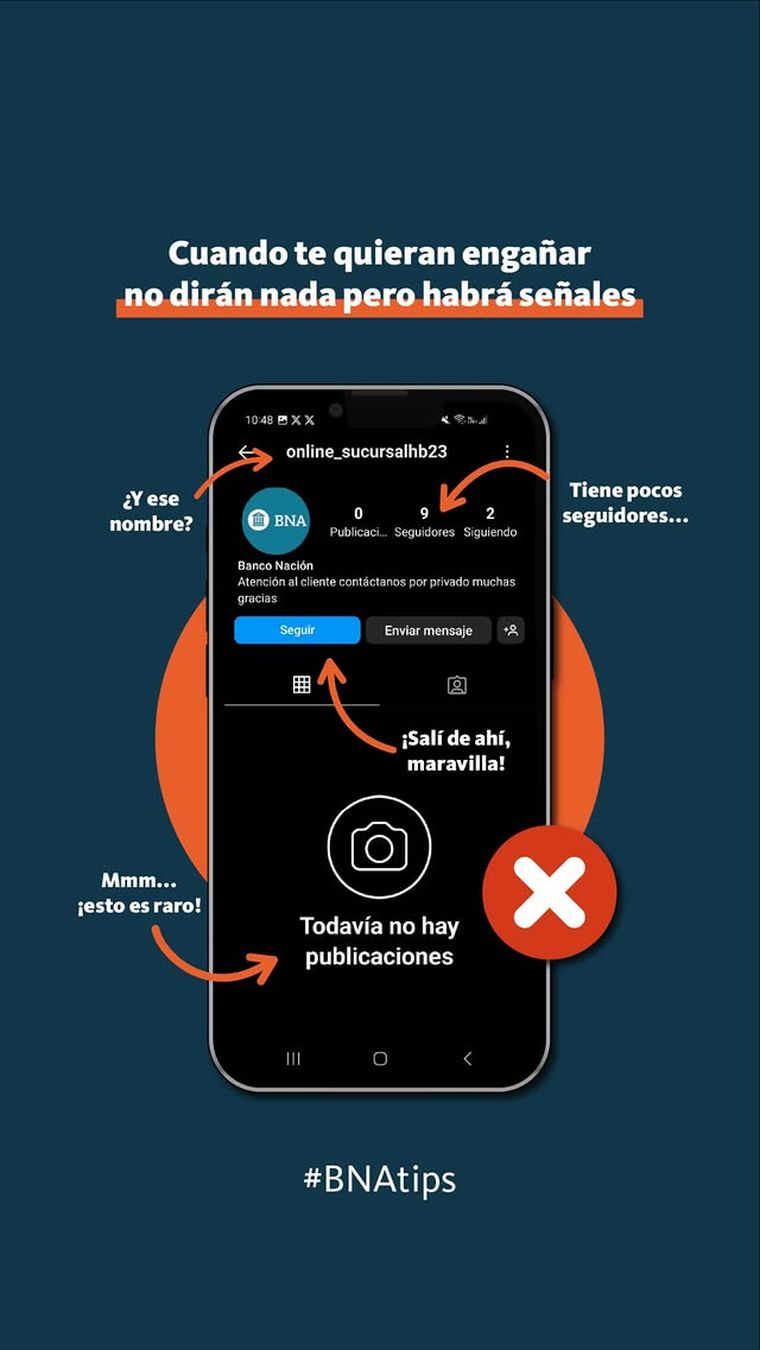 El Banco Nación tiene un único perfil oficial y está verificado con la tilde azul. Si otro intenta hacerse pasar por la entidad, lo recomendable es denunciarlo y bloquearlo. Así no solo te cuidás vos, también evitás que le pase a alguien más. Y, por más apuro que tengas, nunca abras enlaces que te manden por chat o comentarios: si querés verificar algo, entrá vos mismo a la app o al sitio oficial.