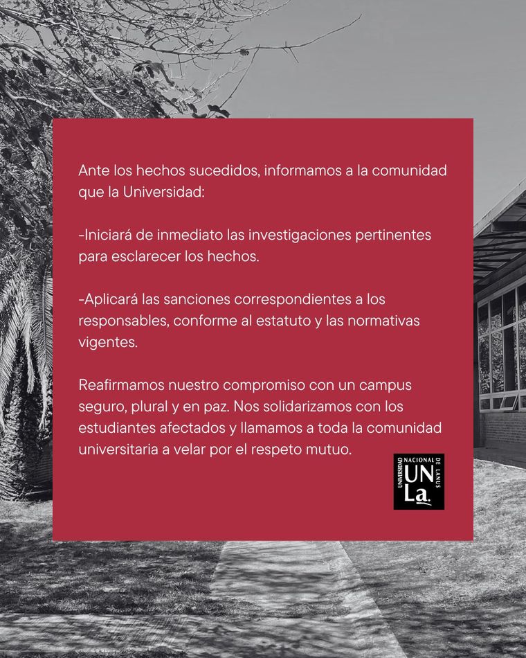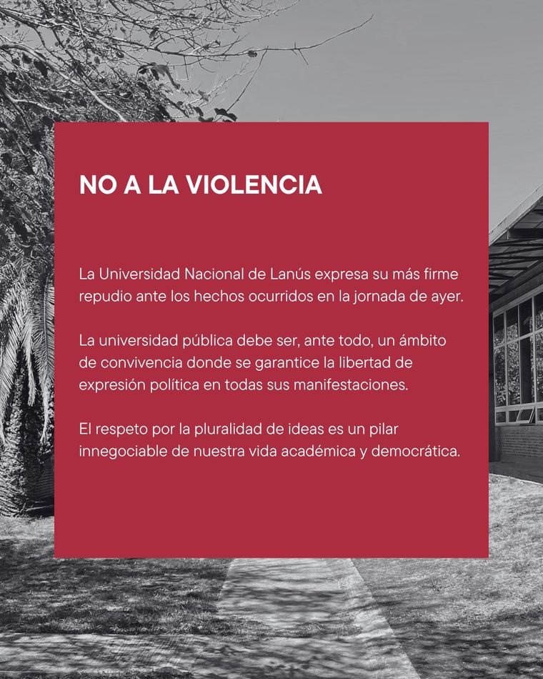 La Universidad Nacional de Lanús (UNLa) expresó su “más firme repudio” por los hechos ocurridos durante la jornada del miércoles y aseguró que iniciará una investigación para determinar responsabilidades.
