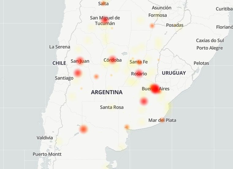Además, el sitio desplegó un mapa en tiempo real que permite visualizar las zonas afectadas en todo el país. De acuerdo a esa información, los principales puntos con problemas son la Ciudad y la provincia de Buenos Aires, Rosario, Córdoba, Tucumán, San Juan y Mendoza. En paralelo, algunas ciudades de estas provincias presentan afectaciones parciales, con fallas intermitentes en el servicio.