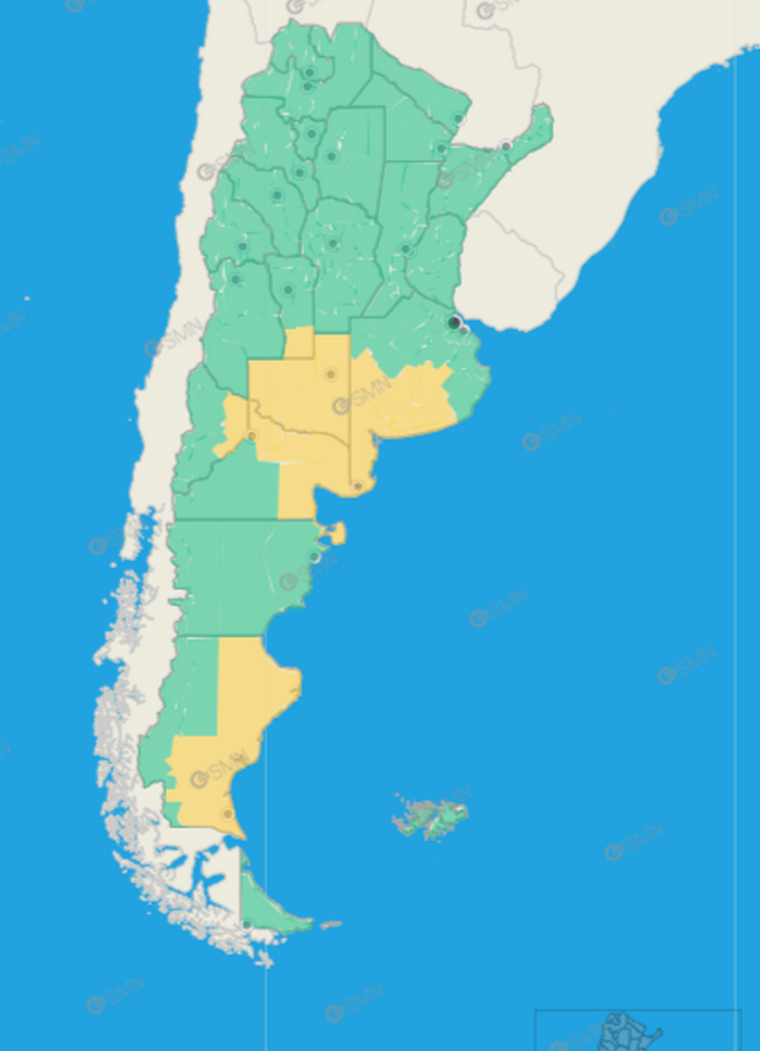 Al mismo tiempo, el primer día de 2026 estará marcado por alertas amarillas por vientos en amplias zonas del país, con especial impacto en la Patagonia. En Santa Cruz, se prevén vientos fuertes con ráfagas que pueden alcanzar entre 90 y 100 km/h, especialmente en el centro y este provincial.