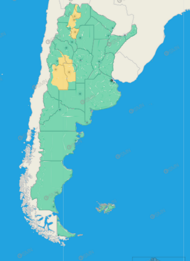 En el norte argentino y sectores de la zona central, se mantienen las alertas amarillas por tormentas. Se esperan fenómenos aislados de variada intensidad, con posibilidad de que algunos eventos sean localmente fuertes.