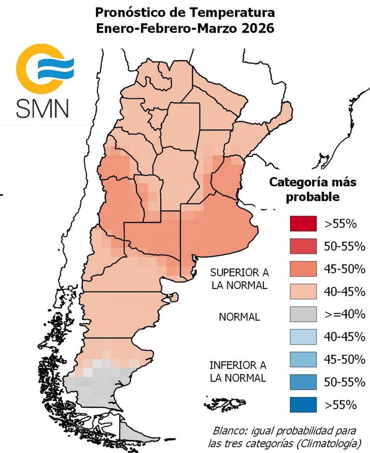 En materia de temperaturas, el escenario proyectado por el SMN muestra una mayor probabilidad de valores normales a superiores a los normales para la época en casi todo el territorio nacional. Las marcas térmicas más elevadas se esperan en amplias zonas del norte del país, el oeste de Santa Fe, Córdoba y el norte y centro de la Patagonia.