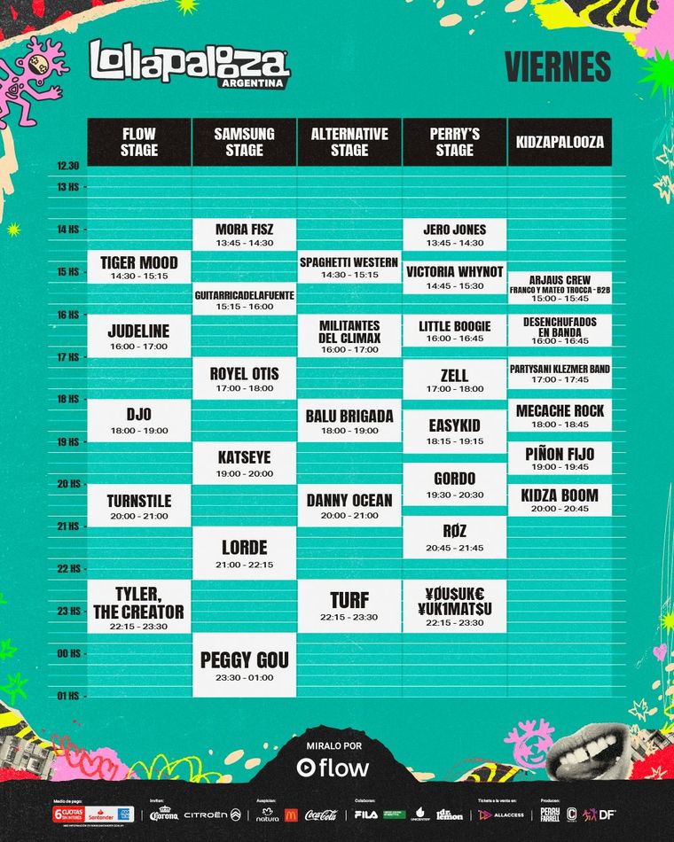 El sábado 14, la actividad también arrancará 12:30. La segunda jornada estará marcada por el esperado show de Chappell Roan a las 22:15 en el escenario Flow y tendrá un cierre electrónico increible de la mano de Skrillex en el Samsung a las 23:45. Además, figuras locales como Paulo Londra, Angela Torres y Soledad se intercalarán con visitas internacionales de la talla de Lewis Capaldi, Marina y Addison Rae. En el Kidzapalooza se podrán disfrutar los shows de School of Rock y Panam y Circo, entre otros.