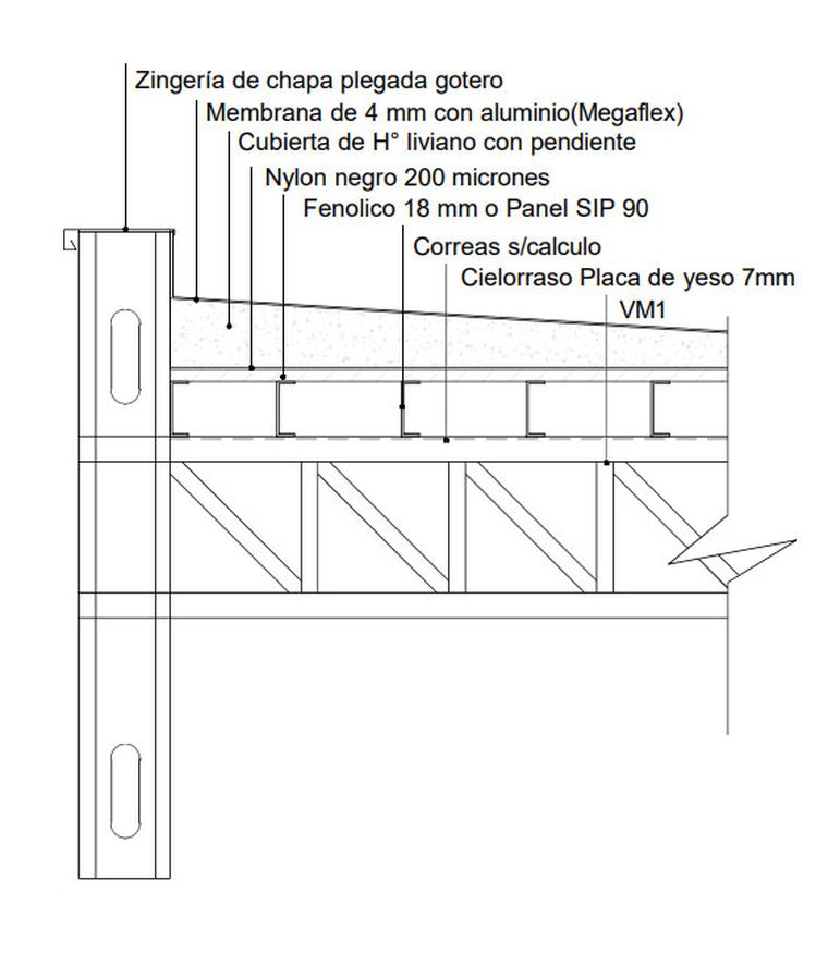 La zona de la construcción está cercada por cierres de obra. La empresa ya tenía instalada las estructuras de hierro y parte del techo. A propósito de este, el detalle de la licitación tiene anexo el plano de la construcción del techo. Incluye una membrana de aluminio, una cubierta de hormigón liviano, nylon, fenólico, correas y un cielorraso ya con vista al interior.