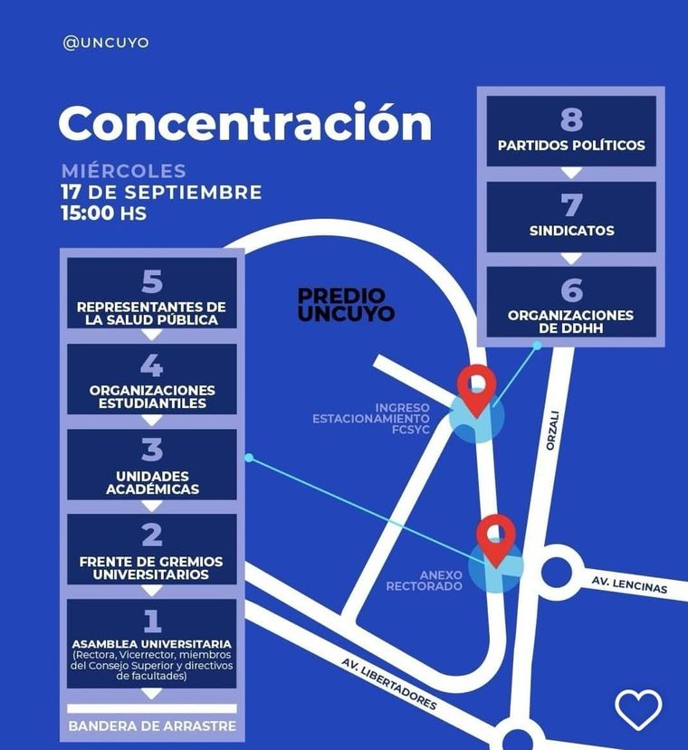 El recorrido fue acordado por las autoridades universitarias y la Ciudad de Mendoza, ya que pertenecen a esa comuna las calles por donde pasará la movilización. Pero además, la UNCuyo invitó a la concentración desde las 15 por grupos para que haya un orden en la movilización.