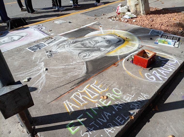 Entre las filas y el movimiento constante, Ariel dibujaba en el suelo con tiza y carbón. Su obra, destinada a desaparecer con el paso de la gente, se armaba en el momento. “Estamos haciendo arte efímero… dura el momento”, explicó. “Es mi actividad cotidiana, mi sustento de mi vida, de mi hijo”, agregó.