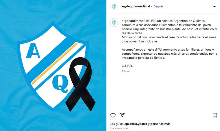 El club emitió un comunicado en redes sociales: “Lamentamos el fallecimiento del joven Benicio Farji, integrante de nuestro plantel de básquet infantil. Acompañamos a sus familiares, amigos y compañeros en este difícil momento, expresando nuestras más sinceras condolencias por la irreparable pérdida”.