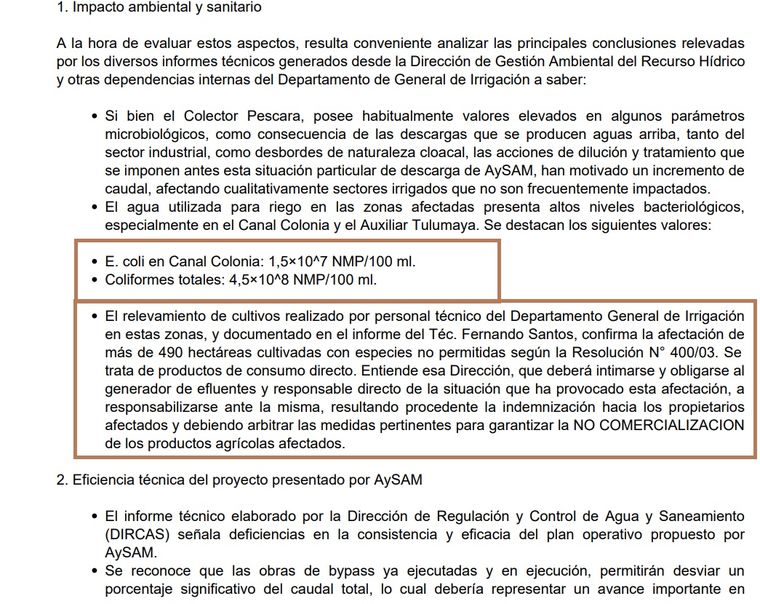 “El agua utilizada para riego en las zonas afectadas presenta altos niveles bacteriológicos, especialmente en el Canal Colonia y el Auxiliar Tulumaya...El relevamiento de cultivos realizado por personal técnico del Departamento General de Irrigación en estas zonas, y documentado, confirma la afectación de más de 490 hectáreas cultivadas con especies no permitidas", determinaba la resolución origina. Por eso, por ejemplo, se declaró la prohibición de comercialización de productos de esa zona y se ordenó que Aguas Mendocinas se haga cargo.