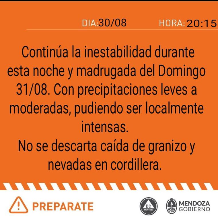 En tanto, el Servicio Meteorológico Nacional emitió un alerta naranja por lluvias en el Gran Mendoza, la zona este y San Rafael y General Alvear. También un alerta amarilla por vientos para los mismos departamentos. Sobre la zona de alta montaña pesa un alerta naranja por nevadas.