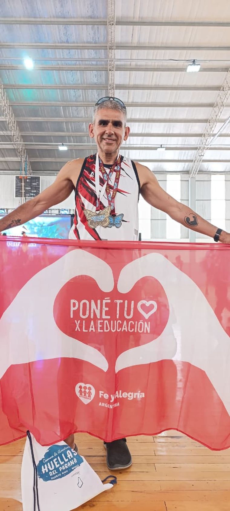 cada vez que participa en una carrera lleva consigo la bandera roja de Fe y Alegría