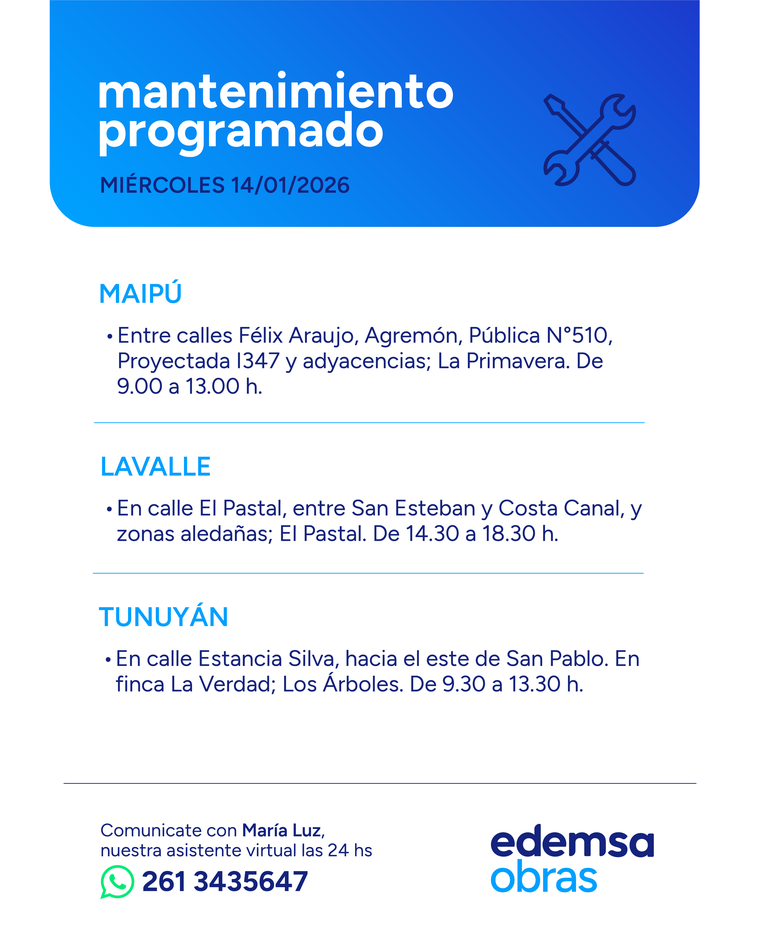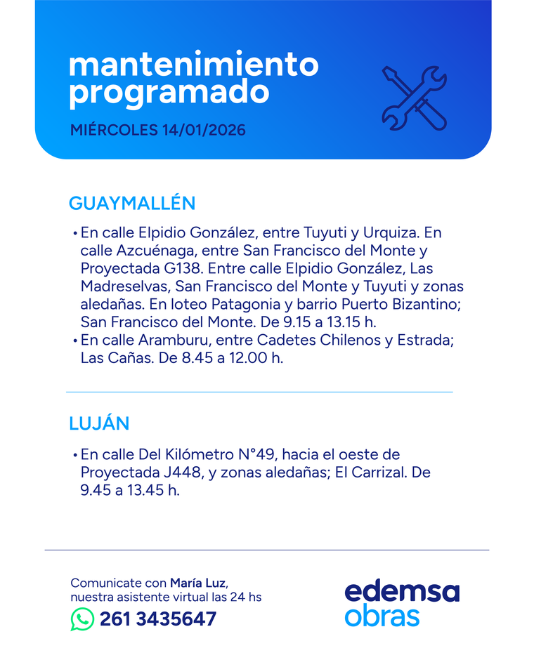 Para chequear cambios de último momento o confirmar si una cuadra específica queda dentro del perímetro, Edemsa indicó que el detalle semanal puede consultarse en su sitio de mantenimiento. También está disponible María Luz, la asistente virtual con atención las 24 horas, a través del 261 3435647.