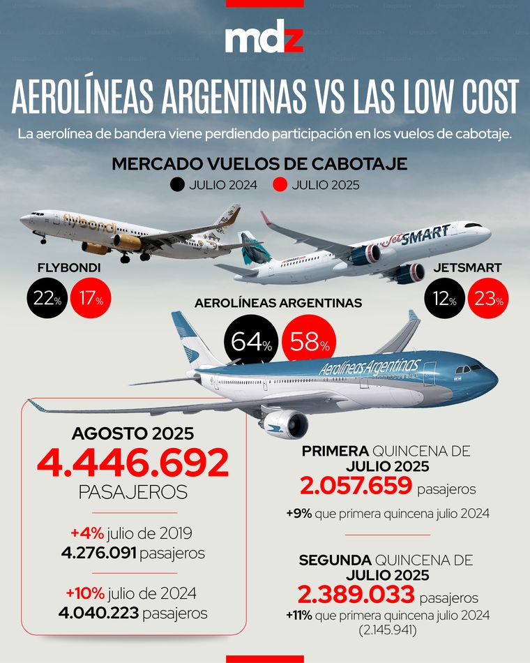 Con este nuevo cambio, desde finales de 2023 hay un resurgir de compañías como JetSMART y Flybondi y, de a poco, se están sumando nuevos operadores. En el mercado de cabotaje se refleja la mayor competencia. En julio de 2024, Aerolíneas Argentina dominaba el 64% de las operaciones de cabotaje, mientras que el mes pasado la participación de la compañía de bandera bajó a 58%.