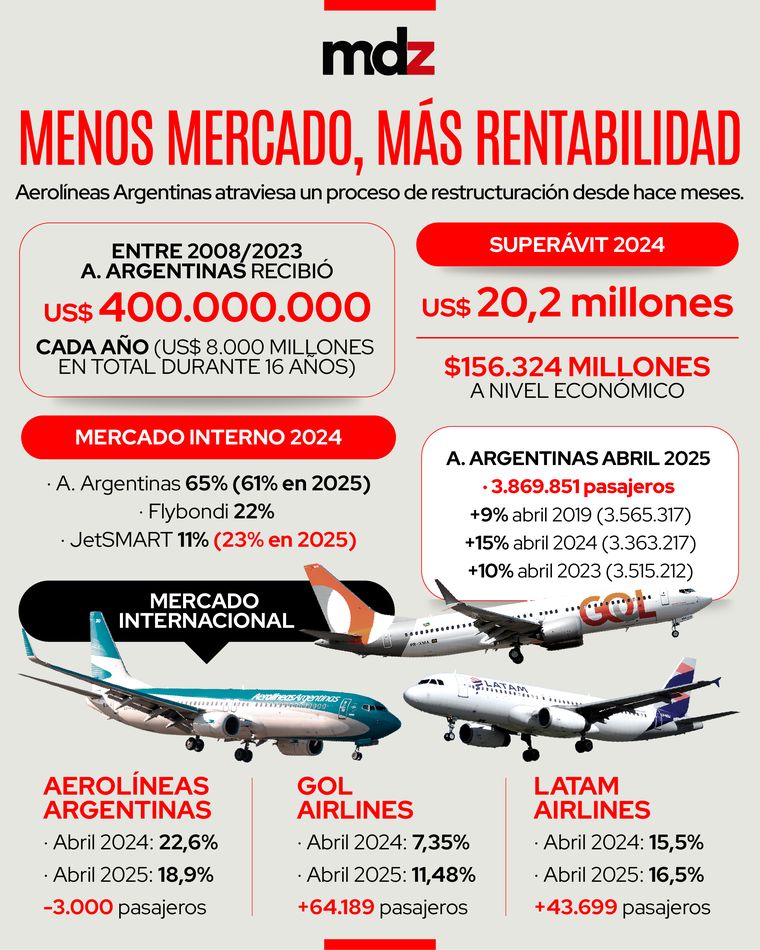 Lo que muestran estos datos es que Aerolíneas Argentinas logró mejorar su ecuación financiera y salir de los números rojos, pese a haber perdido mercado a manos de terceros.