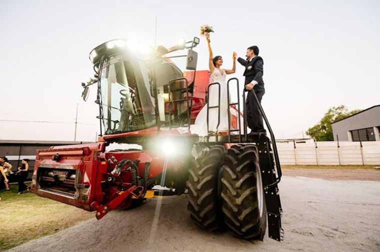 Frente a la mirada entre sorprendida y emocionada de familiares y amigos, la pareja llegó al salón a bordo de una cosechadora Case IH 7250, una imponente máquina fabricada en la planta que la empresa CNH tiene en la ciudad de Córdoba.