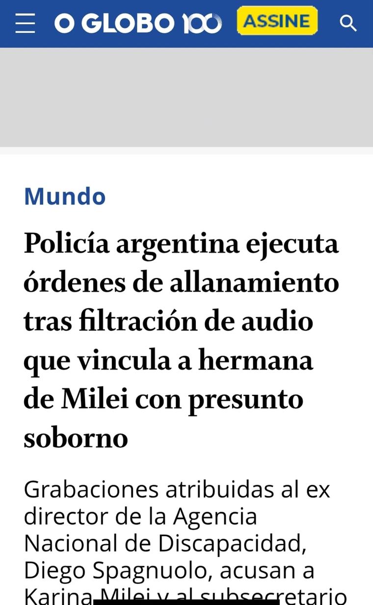 O Globo, desde Brasil, grafican: "La policía argentina ejecuta órdenes de allanamiento tras la filtración de un audio que vincula a la hermana de Milei con un presunto soborno".