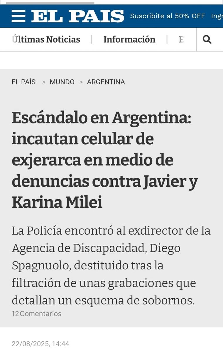 En tanto, en El País de España indican: "Audios, allanamientos y un alto cargo despedido: un caso de corrupción acecha a Milei y su hermana. Señala que Spagnuolo denunció un esquema que recaudaba hasta 800 000 dólares mensuales, beneficiando a altos funcionarios vinculados al presidente.